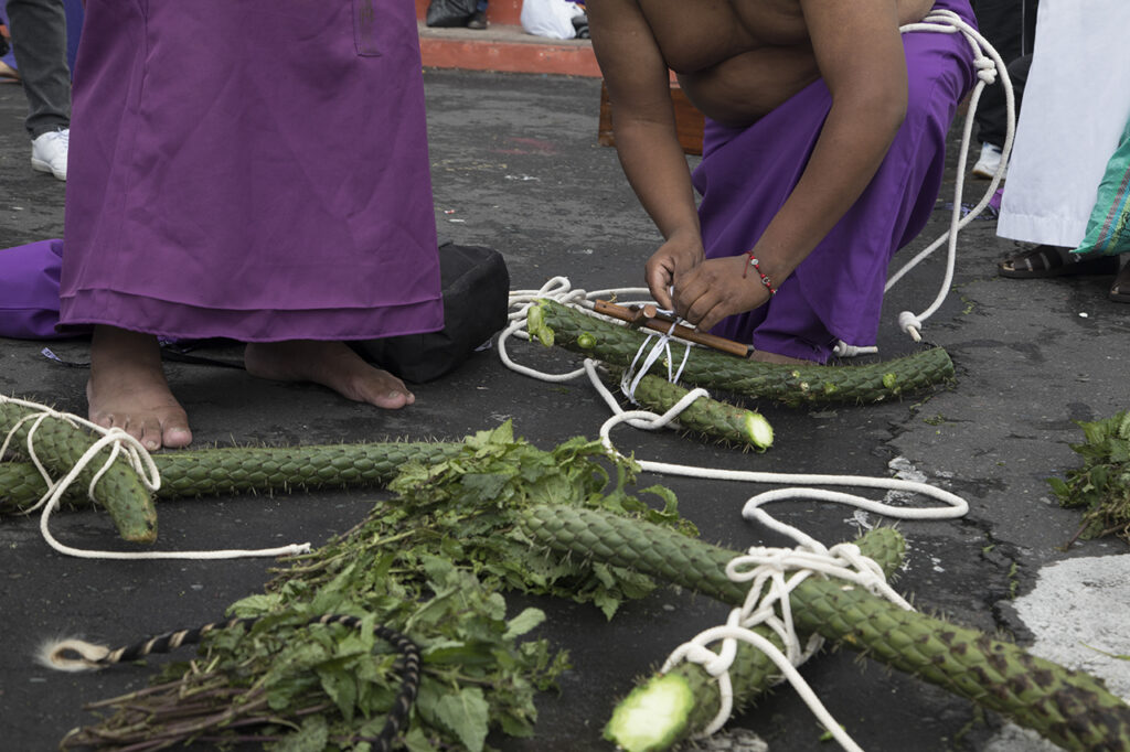 Miguel Cayancela vestido de cucurucho, pero con el torso desnudo elabora una cruz con cáctus. La ata con una cuerda para que quede segura, es un ritual q ue lo practica desde hace 40 años. Cada Viernes Santo participa en la procesión Jesús del Gran Poder, que se celebra en el centro de la ciudad de Quito. Desde muy temprano se concentra en Unidad Educativa Franciscana San Andrés, y se preprara para sentir lo que “Dios sintió”. Cuenta que desde que tenía 14 años acudía a esta peregrinación con sus padres como un espectador.