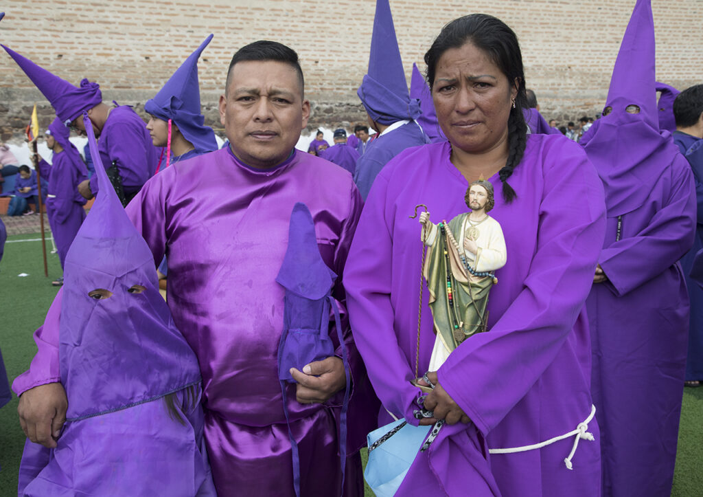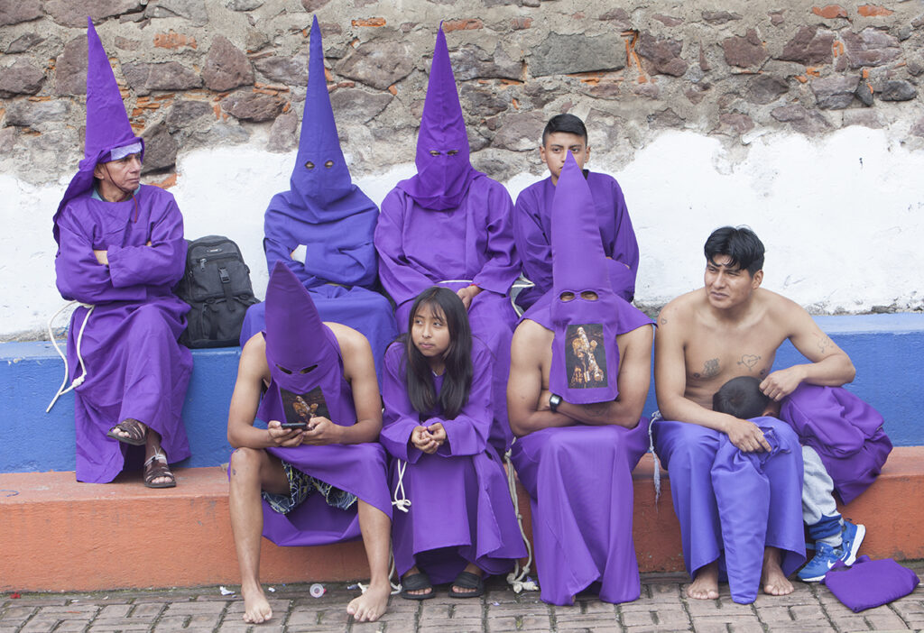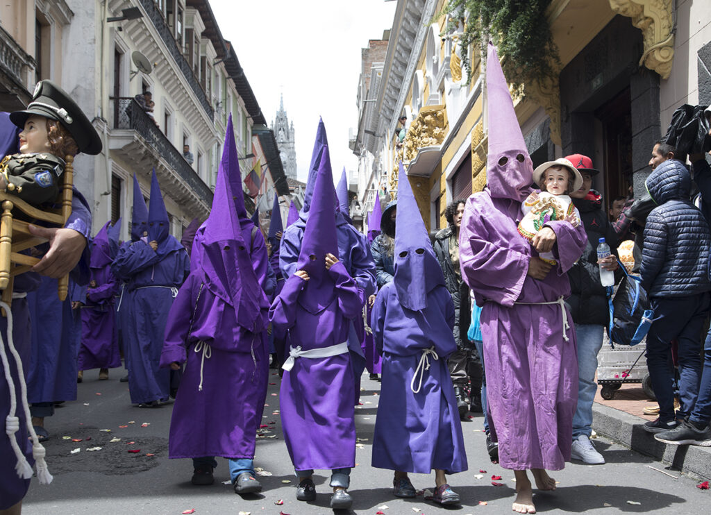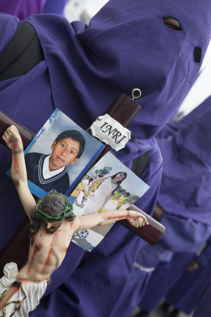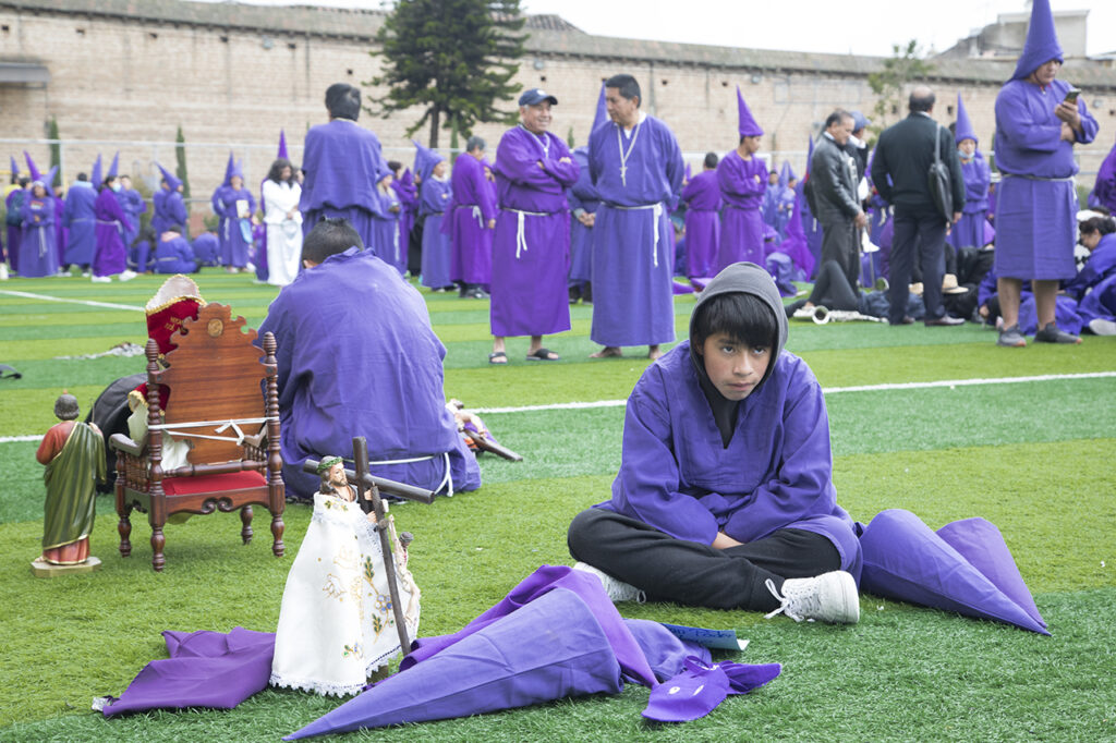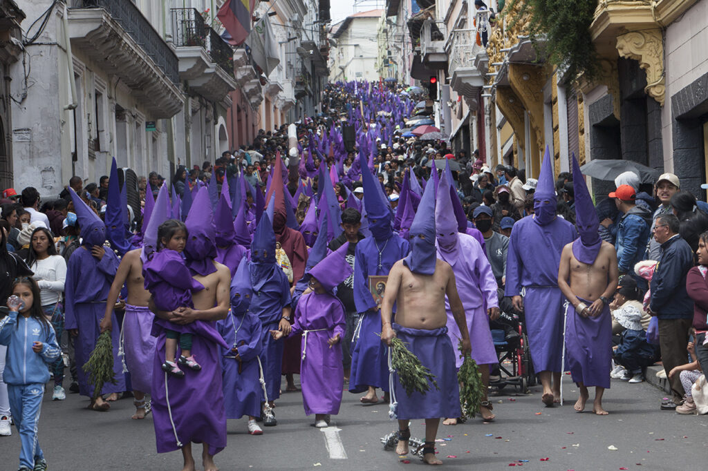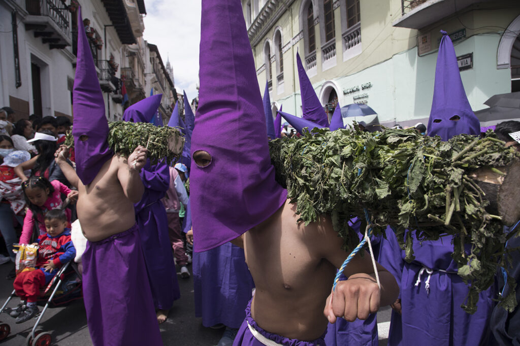 El Viernes Santo es un día especial e importante para los católicos, se conmemora la crucifixión y muerte de Jesús. En Ecuador, la procesión es una tradición que se lleva a cabo desde 1961. Este año fueron 2.000 cucuruchos y verónicas que recorrieron las empinadas calles. Algunos con sus pies descalzos, encadenados, cargando cruces, latigándose, amarrados sus torsos con alambre de púas, otros, orando, llorando mientras alzan fotografías de sus seres queridos, o sosteniendo velas y flores.