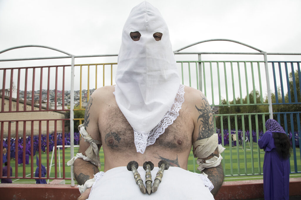 Cada uno vive su espiritualidad de distinta forma. César Benítez, de 44 años, viste pantalones y capucha blanca. Es artista, y desde 2008 cada Viernes Santo vive su fe haciendo un performance durante la procesión. El mismo diseña su traje, no le gusta que sea el mismo todos los años “me interesa enriquecer la tradición”, comenta.