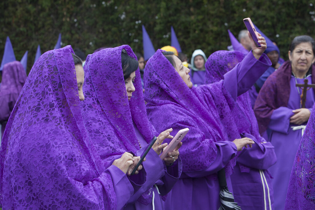 La fe está intacta entre los caminantes y espectadores, aun cuando la tecnología quiere invadirla, los más jóvenes chatean por el celular o se toman selfies, pero siguen el camino.